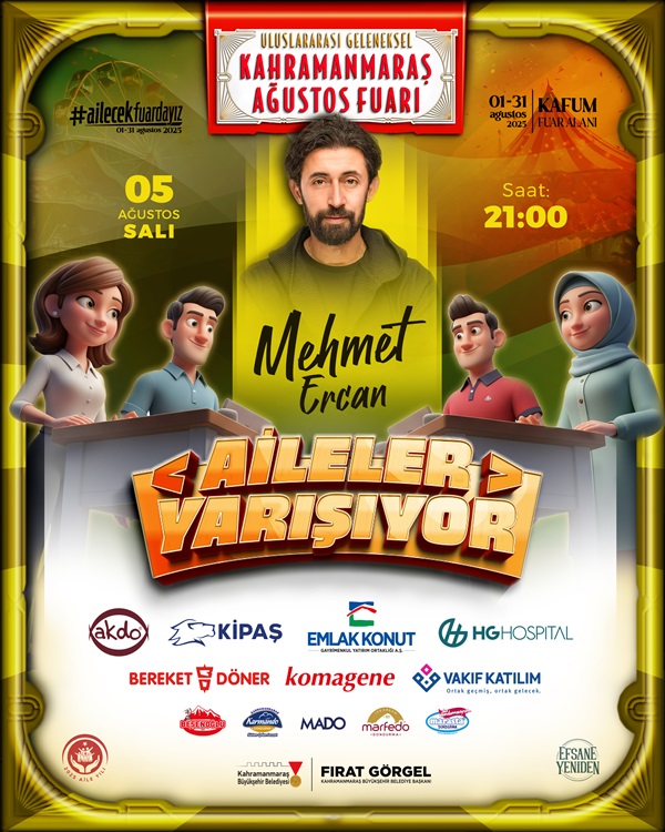 Kahramanmaraş Büyükşehir Belediyesi tarafından “2025 Aile Yılı” kapsamında bu yıl “Ailecek Fuardayız” temasıyla düzenlenen Uluslararası Geleneksel Ağustos Fuarı, şehrin sosyal hayatına canlılık katmaya devam ediyor. 7’den 70’e her yaştan vatandaşın büyük ilgi gösterdiği fuar, KAFUM Fuar Alanı’nda binlerce misafiri ağırlamayı sürdürüyor. Etkinlik takvimi kapsamında 5 Ağustos Salı günü, aile bireylerini aynı sahnede buluşturacak özel bir program daha gerçekleştirilecek. Türkiye’nin sevilen yazar ve sanatçılarından Mehmet Ercan’ın sunumuyla sahne alacak “Aileler Yarışıyor” programı, fuara gelen ziyaretçilere keyifli ve unutulmaz anlar yaşatacak. Eğlence ve bilginin harmanlandığı yarışma programında, farklı yaş gruplarından aile üyeleri hem takım ruhunu pekiştirecek hem de izleyenlere kahkaha dolu anlar yaşatacak. Saat 21.00’da başlayacak programda katılımcı aileler arasında gerçekleşecek dostane rekabet, fuar atmosferine neşe katacak. Büyükşehir Belediyesinden yapılan açıklamada, tüm vatandaşlar programa davet edilirken, fuar boyunca sürecek etkinliklerin takvimi ve detaylarına https://kahramanmaras.bel.tr/duyuru/2025/07/31/geleneksel-agustos-fuari-etkinlik-takvimi adresinden ulaşılabileceği hatırlatıldı.