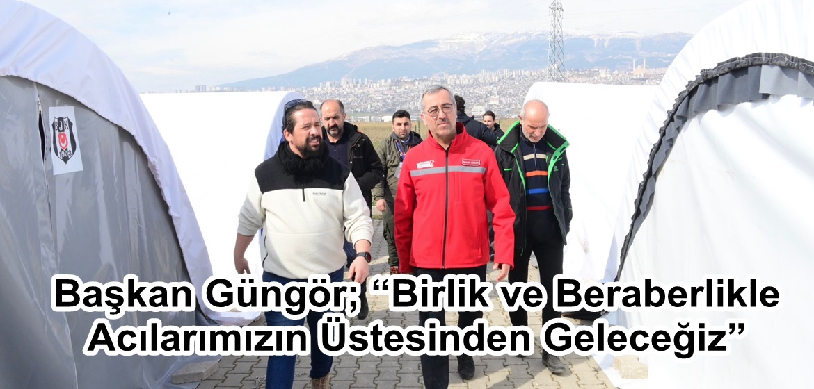 Başkan Güngör, “Şehrimizin farklı noktalarında geçici barınma merkezleri kuruluyor. Taziye evlerimizde de barınma sağlıyoruz. Vatandaşlarımıza günlük sıcak yemek ve ekmek ulaştırıyoruz. Daima hemşehrilerimizin yanındayız, onları yalnız bırakmadık, bırakmayacağız. Bugün de Beşiktaş JK tarafından Merkez Spor Kompleksi içerisinde kurulan çadırları ziyaret ettik. Sabırla, birlik ve beraberlikle acılarımızın üstesinden geleceğiz. Beşiktaş Kulübü’ne ve bu noktada desteğini eksik etmeyen tüm kurum ve kuruluşlarımıza teşekkür ediyoruz” cümlelerini kaydetti.