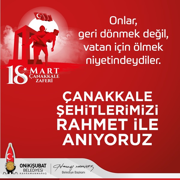 18 Mart Çanakkale Zaferi ve Şehitleri Anma Günü dolayısıyla mesaj yayımlayan Onikişubat Belediye Başkanı Hanefi Mahçiçek, “Kadim tarihimizin önemli dönüm noktalarından biri olan Çanakkale Zaferi, Kurtuluş Savaşı’mızın da habercisi olmuştur. Bu destansı savaş için Kahramanmaraş’ımızdan, Çanakkale cephesine giden ismi tespit edilmiş 236 şehidimiz vardır ve Çanakkale ruhu yıllar sonra Kahramanmaraş’ta vücut bulmuştur” dedi.