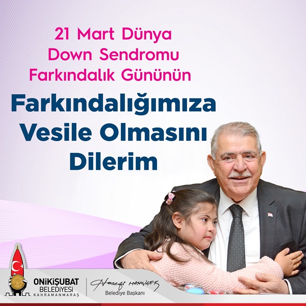 21 Mart Dünya Down Sendromu Farkındalık Günü dolayısıyla kutlama mesajı yayımlayan Onikişubat Belediye Başkanı Hanefi Mahçiçek, “Kocaman yüreklerinde taşıdıkları sonsuz sevgileri ile bizlerin hayatına tarif edilemez bir güzellik katan Down Sendromlu kardeşlerimizin her zaman yanında olduğumuzu belirtiyor, 21 Mart Down Sendromu Farkındalık Günü’nün toplumsal bilinci geliştirecek çalışmalara katkı sağlamasını ümit ediyor, kendilerine ve ailelerine sevgi ve saygılarımı sunuyorum” dedi.