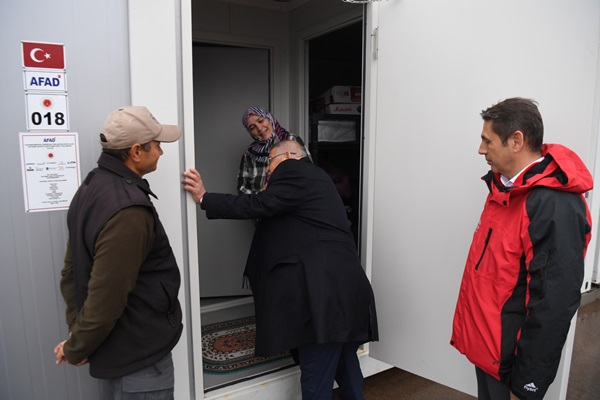 İnceleme ve denetlemelerde bulunmak üzere konteyner kente giden Başkan Mahçiçek, konteynerlere yerleşen depremzede ailelerle bir araya geldi.