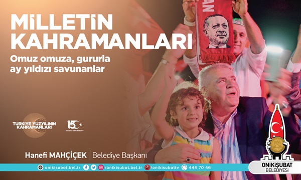 15 Temmuz Demokrasi ve Milli Birlik Günü dolayısıyla mesaj yayımlayan Onikişubat Belediye Başkanı Hanefi Mahçiçek, “7 yıl önce bugün, üstün cesareti ve fedakârlıklarıyla hain darbe girişimini Türkiye’nin demokrasi zaferine dönüştüren ‘Türkiye Yüzyılı’nın Kahramanları’ tüm şehitlerimize Cenab-ı Hakk’dan rahmet diliyor, o zafer gecesinde şahlanan gazilerimize ve tüm vatandaşlarımıza şükranlarımı sunuyorum. 15 Temmuz’da Türkiye Yüzyılı’nın Kahramanları’yla hainlere geçit vermedik, bundan sonra da vermeyeceğiz” dedi.