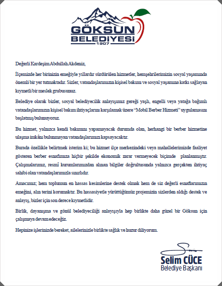 “Değerli Berber kardeşim! ilçemizde her birinizin emeğiyle yıllardır sürdürülen hizmetler hemşehrilerimizin sosyal yaşamında önemli bir yer tutmaktadır. Sizler vatandaşlarımızın kişisel bakımı ve sosyal yaşamına katkı sağlayan kıymetli bir meslek grubusunuz. Belediye olarak Bizler Sosyal Belediyecilik anlayışımız gereği yaşlı engelli veya yatağa bağımlı Vatandaşlarımızın Kişisel bakım ihtiyaçlarını karşılamak üzere Mobil Berber Hizmeti uygulamasını başlatmış bulunuyoruz. Bu hizmet yalnızca kendi bakımını yapamayacak durumda olan, herhangi bir berber hizmetine ulaşma imkanı bulunmayan vatandaşlarımızı kapsayacaktır. Burada Özellikle belirtmek isterim ki bu hizmet ilçe merkezindeki veya mahallelerimizde faaliyet gösteren Berber esnafımıza hiçbir şekilde ekonomik zarar vermeyecek biçimde planlanmıştır. Çalışmalarımız resmi kurumlarımızdan alınan bilgiler doğrultusunda yalnızca gerçekten ihtiyaç sahibi olan vatandaşlarımızla sınırlıdır.