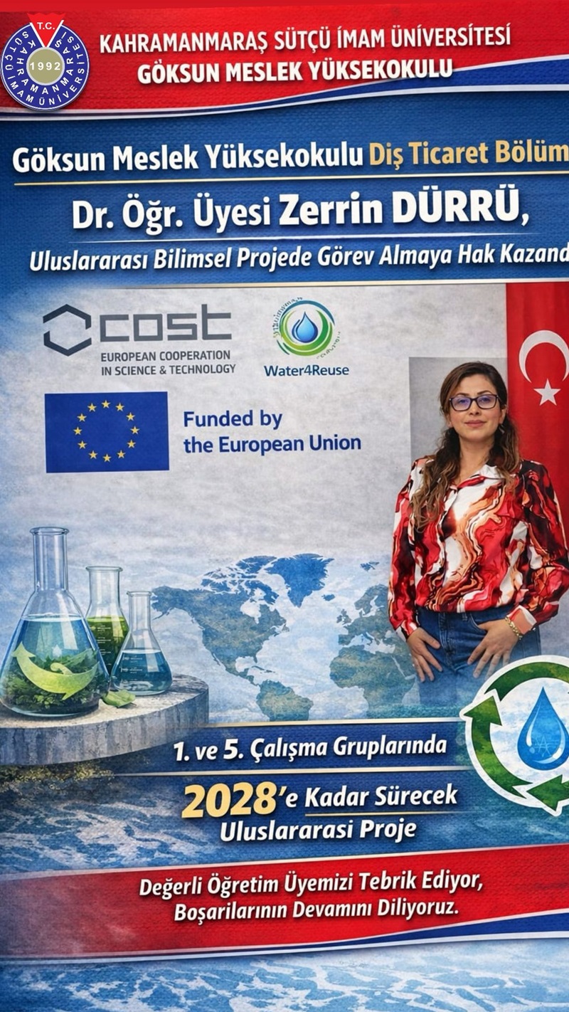 Öğretim üyemiz; Avrupa Bilim ve Teknoloji İş Birliği Kuruluşu (COST-European Cooperation in Science and Technology) bünyesinde yürütülen, CA23104 kodlu “Mainstreaming Water Reuse into the Circular Economy Paradigm (Water4Reuse)” aksiyonu uluslararası çalışma grubunun 1. ve 5. çalışma gruplarına araştırmacı üye olarak seçilmiştir. Söz konusu çalışma; suyun geri dönüşümünü döngüsel ekonomi paradigmasına entegre etmeyi amaçlamakta olup çalışmanın 2028 yılında tamamlanması planlanıyor.