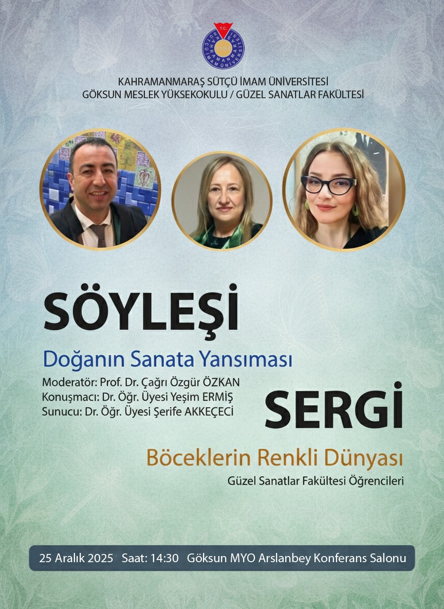 Sergi açılışının ardından gerçekleşecek “Doğanın Sanata Yansıması” başlıklı söyleşide, doğa ile sanat arasındaki bu güçlü ilişki daha yakından konuşulacak. Söyleşi; KSÜ Göksun Meslek Yüksekokulu Bitkisel ve Hayvansal Üretim Bölümü, Organik Tarım Programı öğretim üyesi Prof. Dr. Çağrı Özgür ÖZKAN’ın moderatörlüğünde, aynı bölümden Dr. Öğr. Üyesi Şerife AKKEÇECİ’nin sunuculuğunda gerçekleşecek. Söyleşinin konuğu ise, sergide yer alan çalışmaların ortaya çıkmasında önemli payı olan Dr. Öğr. Üyesi Yeşim ERMİŞ olacak.