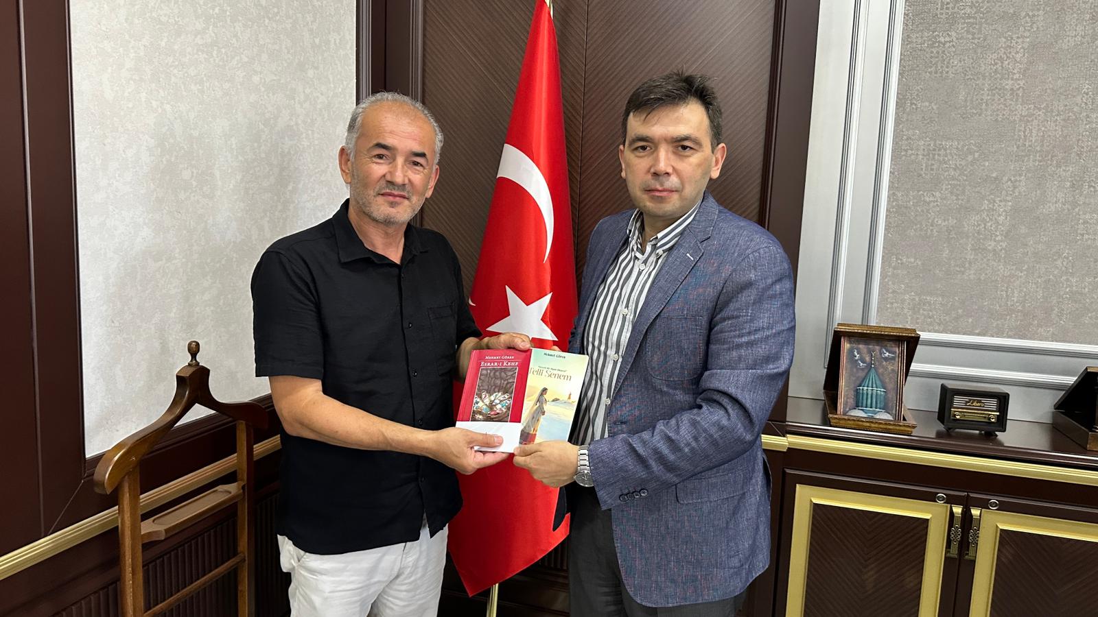 Ziyarette Göksun Haber Merkezi Yazı İşleri Müdürü Mehmet Gören Kaymakam Cengiz Ayhan’a “Esrarı Kehf” ve “Telli Senem” adlı kitaplarını hediye etti.