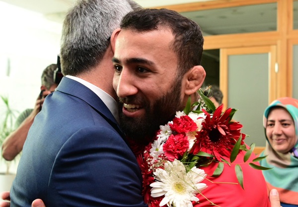 Kahramanmaraş Büyükşehir Belediye Başkanı Hayrettin Güngör, ulusal ve uluslararası arenada gösterdiği başarılarla adından söz ettiren ve son olarak Sırbistan’ın başkenti Belgrad’da düzenlenen Büyükler Dünya Güreş Şampiyonası’nda grekoromen stil 82 kiloda altın madalya kazanarak Türk Bayrağı’nı kürsüde dalgalandıran Kahramanmaraşlı milli güreşçi Burhan Akbudak ve ailesini makamında ağırladı. Ziyarette; ilçe belediye başkanları, Gençlik ve Spor İl Müdürü Cemil Boz ve Büyükşehir Belediye meclis üyeleri de yer aldı. Ziyaretten duyduğu memnuniyeti ifade eden Başkan Hayrettin Güngör, milli sporcu Akbudak’a başarı dileklerini iletirken çeşitli hediyeler de takdim etti.
