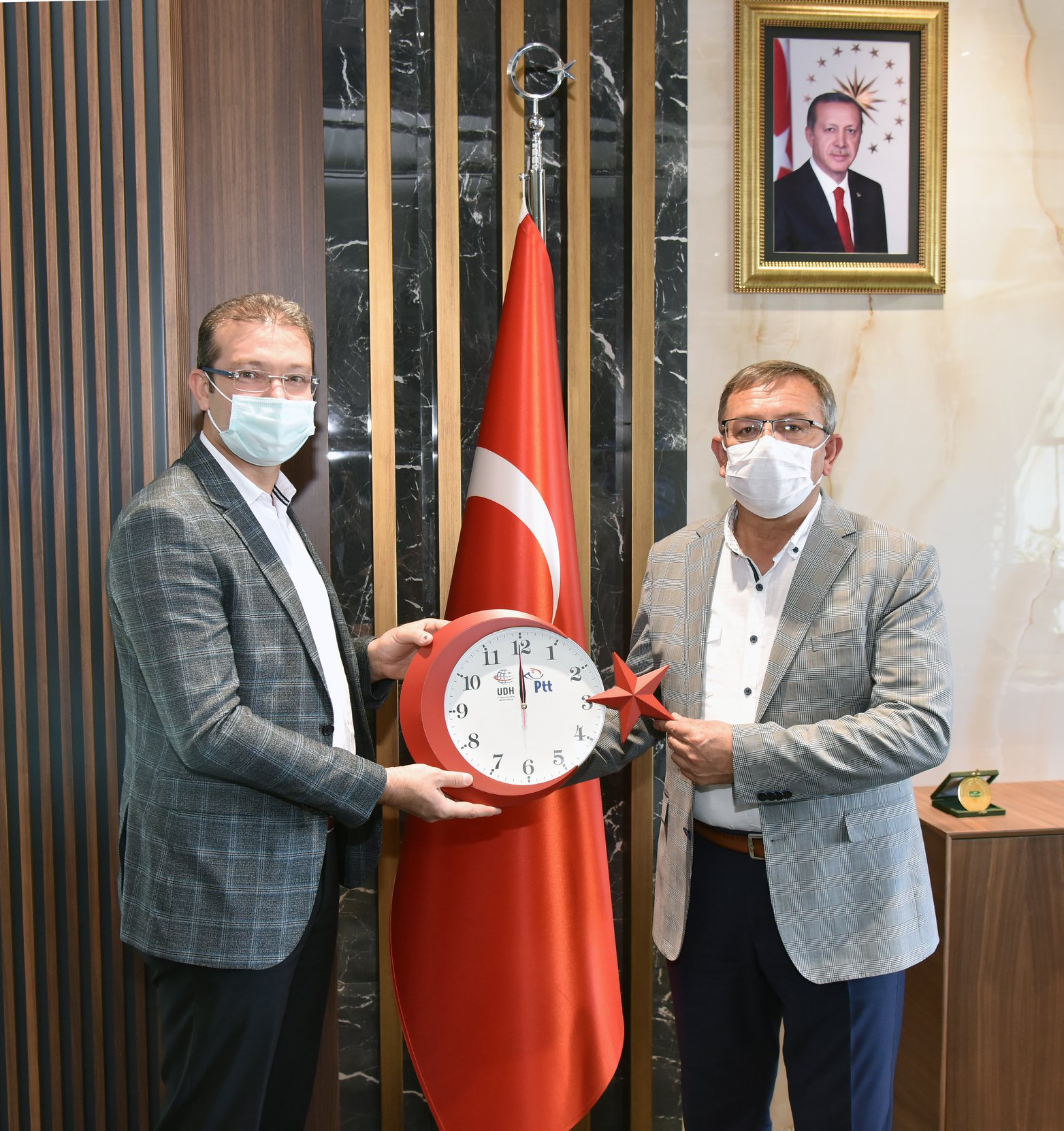 Başmüdür Oğuzhanoğlu, ziyarettin anısına Başkan Aydın’a Ptt logolu Türk Bayraklı saat hediye etti.