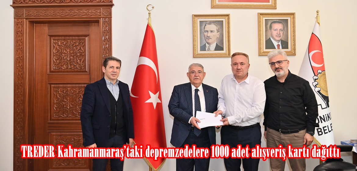 TREDER son olarak Ramazan ayında Kahramanmaraş’taki depremzedeler için Onikişubat Belediyesi’ne 1000 adet alışveriş kartı verdi. Onikişubat Belediye Başkan Hanefi Mahçiçek, TREDER tarafından yapılan yardım ile ilgili yaptığı açıklamada ‘’Bu ziyaret vesilesiyle TREDER, bin tane ihtiyaç sahibi ailelerimize dağıtmak üzere hediye kartı getirdiler. İşte bizim milletimizin güzelliklerinden birisi de bu. Özellikle Ramazanda paylaşmanın, yardımlaşmanın en güzel örneğini TREDER gösterdi. Biz de bunları ihtiyaç sahibi kardeşlerimize, belediyemiz kanalıya dağıtacağız. Ben kendilerine böyle güzel bir adedi devam ettirdikleri için, yardımlaşmanın en güzel örneklerinden birini icra ettikleri için çok teşekkür ediyorum.’’ şeklinde konuştu.